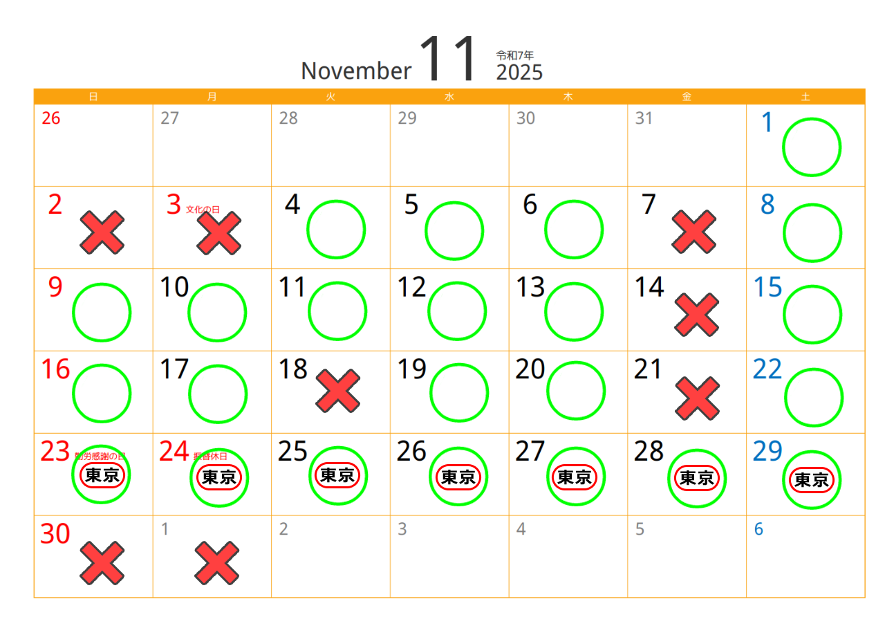 2025年11月のお休み 2(日) 3(月) 18(火) 30(日)